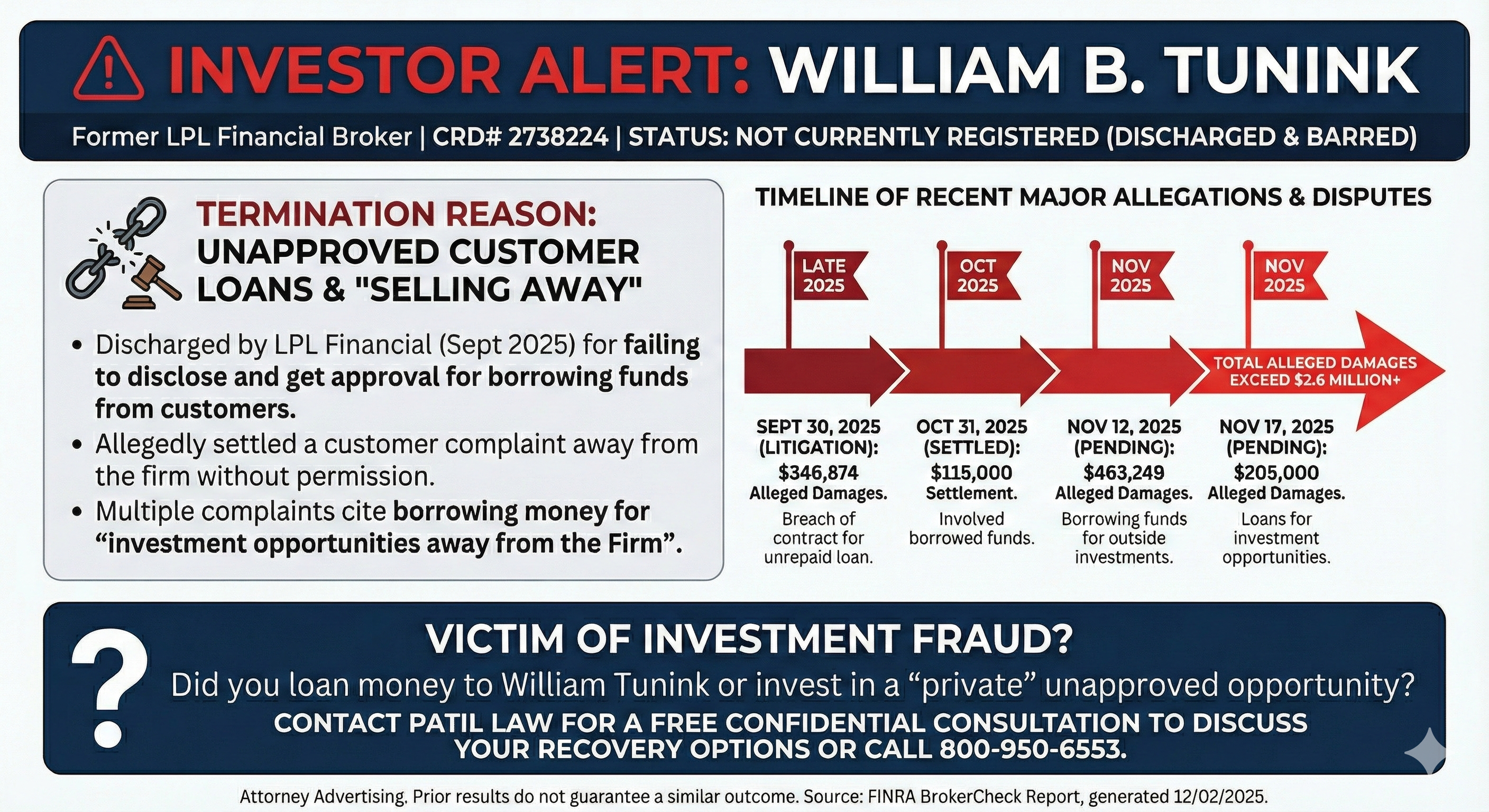 Los Angeles, CA – November 22, 2025 – Chetan Patil of Patil Law, P.C., a securities fraud attorney, is investigating William Bernard Tunink (CRD# 2738224), a former broker with LPL Financial LLC. According to FINRA records, Tunink faces 8 customer complaints alleging unauthorized borrowing from customers and undisclosed loans, with total damages of approximately $270,600 in settlements plus over $1.1 million in pending claims. Tunink was terminated by LPL Financial in September 2025 for failing to disclose customer loans and settling complaints away from the firm.